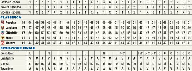 В плей-аут принимают участие коллективы, занявшие 18-е и 19-е место. Однако состоится он лишь в том случае, если между командами не больше четырех очков. Сейчас Читтаделла опережает Виченцу на шесть пунктов. Таким образом, только победа бьянко-росси в последнем туре и неудача Читтаделлы позволит Виченце получить шанс на спасение. Не стоит забывать и о Реджине с Виртусом Ланчано, которые также еще не обеспечили себе спасение.