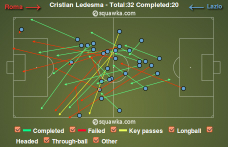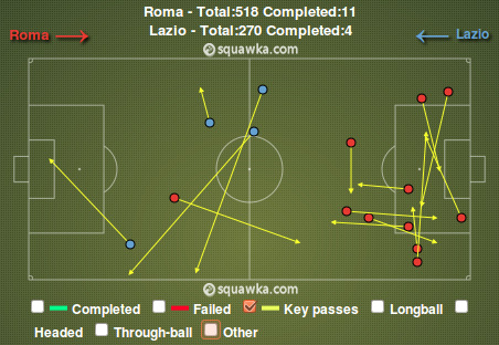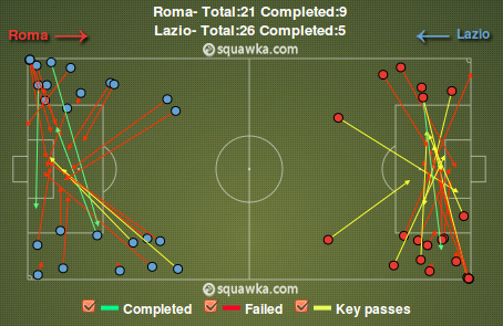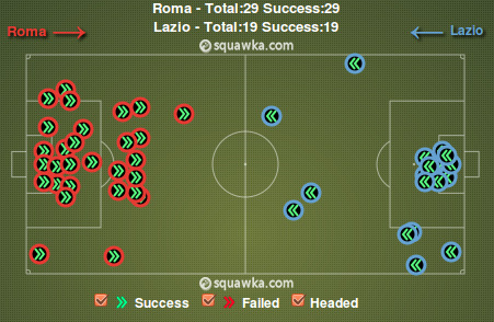 Если комбинационная игра у Лацио не клеилась, то на выручку команде могли прийти фланговые подачи. Орлы действительно активно использовали это оружие, но оно раз за разом стреляло холостыми. Из 26 подач в штрафную Ромы достигли цели только пять, и лишь две из них были действительно опасны. Тогда как у Волков прошли девять кроссов из 21 и восемь из них несли угрозу воротам соперника. Этому есть два объяснения. Во-первых, отличная игра центральных защитников Ромы Мехди Бенатья и Леандро Кастана, а также эффективная подстраховка со стороны их партнеров. Во-вторых, большинство своих подач игроки Лацио исполняли наобум, поскольку не могли найти более эффективного продолжения атаки, тогда как их соперники большинство подач исполняли из выгодных позиций, поскольку перед этим им удавалось отыграть защитников и вывести игрока на свободное пространство.