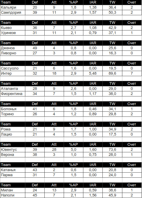 Мы продолжаем применять на практике собственную систему анализа футбольных матчей, с подробностями которой можно ознакомиться во вводном материале (первая часть, вторая часть). После каждого тура итальянской Серии А мы проводим анализ матчей на основе параметров, которые не видны невооруженному глазу.