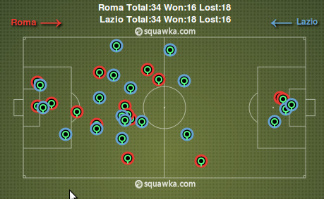Стиль игры обеих команд прекрасно характеризует “география” верховых дуэлей. Большинство из них произошло на половине поля Ромы, поскольку Лацио приходилось развивать атаки за счет длинных и средних передач верхом. Рома комбинировала и играла низом, потому на половине поля Лацио верховая борьба велась только непосредственно в штрафной или около самой центральной линии.