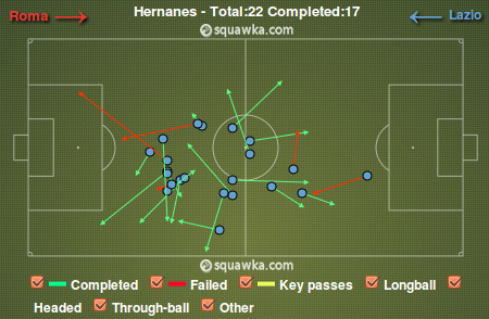 Рома вчистую выиграла у соперника борьбу за центр поля. Даниэле Де Росси, Кевин Строотман и, в меньшей степени, Миралем Пьянич перекрыли кислород главным организаторам игры Лацио — Эрнанесу и Кристиану Ледесме. Шутка ли, бразильский плеймейкер за всю игру не сделал ни одной точной передачи в штрафную соперника и ни одной обостряющей передачи вообще.