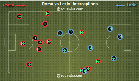 Еще более наглядно превосходство центральной оси Ромы над непосредственными оппонентами демонстрирует количество перехватов и выносов мяча из опорной зоны. Джаллоросси четыре раза перехватывали мяч в своей опорной зоне, а бьянкочелести — лишь однажды. И это при том, что Рома атаковала больше соперника. Кроме того, если игрокам Лацио приходилось выбивать мяч преимущественно из собственной штрафной и ни разу из опорной зоны (а это значит, что они позволяли соперникам загружать мяч в штрафную и не могли остановить их раньше), то Волки десять раз разряжали обстановку за счет выносов из зоны ответственности центральных полузащитников.
