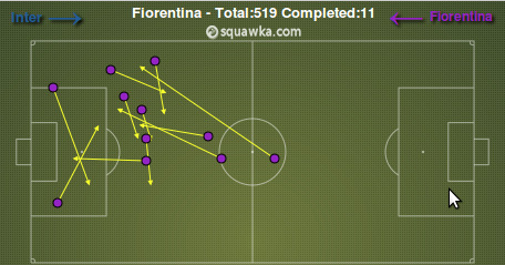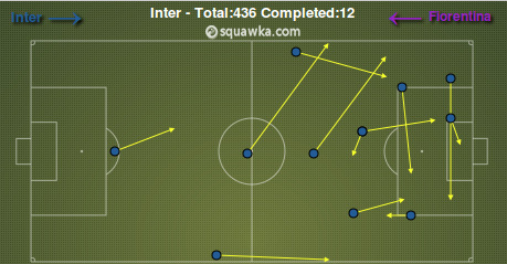 Нерадзурри сделали за игру 12 обостряющих передач, а Фиорентина — 11. При этом у Интера пять из этих пасов нашли адресата в штрафной, тогда как у Фиалок — только три. При этом обращает на себя внимание активность левого фланга Интера в атаке и, соответственно, слабая игра правого защитника Фиорентины Ненада Томовича. Три обостряющие передачи Интера прошли по левому флангу, а еще два — с левого фланга в штрафную.