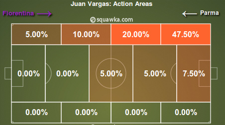 Об эффективности игры Гобби и левого центрального защитника Пармы Фелипе красноречиво расскажет приведенная ниже схема, на которой отмечены зоны активности Фиорентины. Как видите, проводить эффективные атаки по правому флангу Фиалкам удавалось крайне редко.