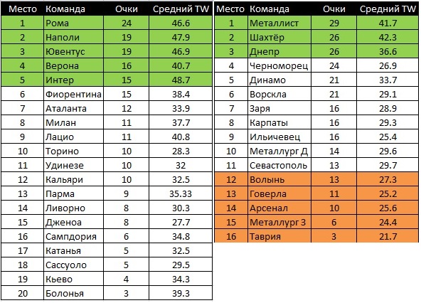 Только у Ромы, Наполи, Ювентуса и Интера средний TW превышает победный уровень. Есть также две аномалии, это Болонья с TW 39,3, которая находится внизу турнирной таблицы, и Торино с показателем 28,3, занимающий 10-ю строчку.