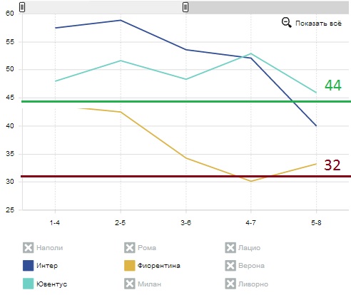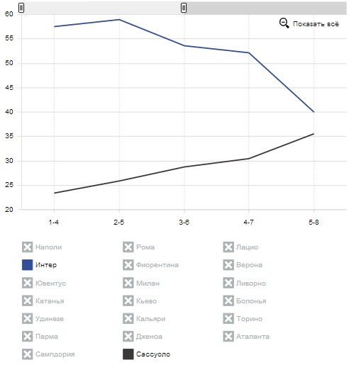 В последнем туре Фиорентина одержала яркую победу над Ювентусом, но все же пока рейтинг эффективности Фиалок далек от чемпионского. Несмотря на поражение, команда Конте продолжает находиться выше уровня 44-х пунктов. Интер, как и Наполи, довольно хорошо начал чемпионат, но во втором игровом месяце команда Маццари выглядела не так убедительно, что впоследствии отобразилось на их рейтинге эффективности.
