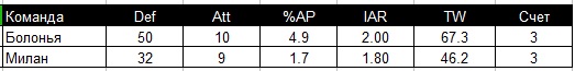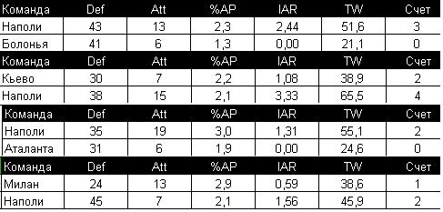 Что касается Болоньи, то эта команда выполняет довольно много передач под удар, но при этом не может извлечь из этого пользу. Например, средний параметр Att в последних четырех играх для этой команды составил 11 пунктов. Для сравнения: у Ромы этот показатель равняется 7,25, а у Торино – 4,75. Но при этом индекс атакующей реализации (IAR=Att*голы/удары) для этих команд: