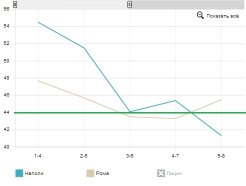Но затем последовала неожиданная ничья с Сассуоло, после чего показатель TW у Наполи постепенно начал снижаться, и с 5-го по 8-й тур он опустился ниже победного уровня.