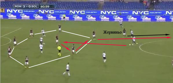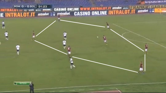 На данном снимке показано развитие позиционной атаки Ромы в матче против Болоньи. Обратите внимание, как плотно располагаются команда Гарсии в зоне игровых действий.