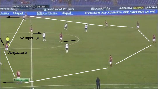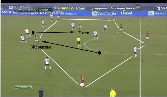 Тотти также участвует в синхронном командном движении, он как раз и оставляет зону для Жервиньо, а сам выдвигается, как Флоренции чуть ранее, навстречу игроку, владеющим мячом. Одно из главных достоинств подобных маневров – это, то, что игроки постоянно находятся в движении, при этом сохраняя компактность в зоне игровых действий, данное обстоятельство позволяет хорошо контролировать мяч и быстро вступать в отбор после потерь.
