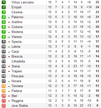 На четвертое место поднялся Палермо, который в гостях обыграл прямого конкурента Авеллино благодаря точным ударам своих нападающих — Кайла Лафферти и Абеля Эрнандеса. Пескара с Брешией выдали развеселую ничью 3:3, которая, однако, не поправила положение ни одной из команд, которые по-прежнему находятся в середине таблицы. Там же застряла и Сиена, которая в этот уикенд не смогла обыграть Читтаделлу. А вот Падова под руководством Бортоло Мутти продолжает подъем — гол Кристиана Паскуато принес бьянкоскудати третью победу в сезоне, и они покинули зону вылета.