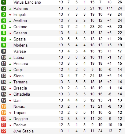 Теперь подопечные Джузеппе Якини всего на два пункта отстают от лидирующего Виртуса Ланчано. Вслед за поражением от Модены команда Марко Барони расписала мировую с Сиеной, которая, похоже, набирает ход. Шанс выйти на первое место получил Эмполи, но неожиданно проиграл в Тернане — единственный гол забил защитник Альберто Мази, 50% на которого принадлежат Ювентусу.