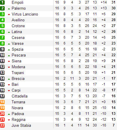 А вот Латина продолжает уверенно набирать очки. Подопечные Роберто Бреды не проигрывают уже 13 (!) матчей — в отчетном туре гол Жонатаса принес им победу над Юве Стабией, занимающей последнюю строчку в таблице. Абсолютно противоположная се