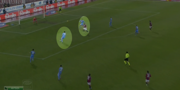 Что опасное Партенопеи удавалось создать лишь усилиями Гонсало Игуаина, который, в отличие, от Пандева, полезно отходил в глубину поля, освобождая пространство для рывков партнеров. В такой ситуации удалось забить Хосе Кальехону, выскочившему на ударную позицию по месту правого инсайда. Сам же Игуаин нанес всего два удара — один из них стал реализованным пенальти. Без качественной поддержки аргентинцу постоянно приходилось перемещаться по фронту атаки, тогда как на ее острие не оставалось никого.