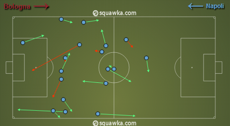 Несмотря на то, что в обороне Болоньи собраны достаточно высокие игроки, в этой игре Наполи сделал ставку на навесы. Дрис Мертенс отказался от привычных смещений с фланга — он угрожал воротам со стандартов, и дважды Джанлука Курчи спасал Фелсинеи. Фланговые игроки Партенопеи грузили мяч в центр, но Наполи не выиграл ни одной верховой дуэли в штрафной. Да и подачи, мягко говоря, выходили неудачными.