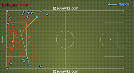 Болонья сделала почти в два раза меньше передач, чем Наполи — 273 против 524. Но разница в количестве ударов минимальна (9:10), а обостряющих пасов у команды Баллардини и вовсе больше (3:2). В первую очередь, это говорит о том, насколько неэффективно провели матч адзурри.