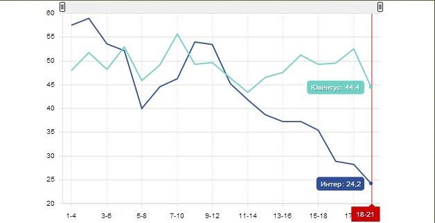 Как можно заметить, Ювентус по сравнению с Интером проходит турнирную дистанцию без существенных спадов. График бьянко-нери еще ни разу не опускался ниже 40 пунктов. А вот Интер лихорадит вовсю – как видим, спад начался еще после девятого тура. За последние 11 матчей рейтинг нерадзурри лишь один раз поднялся выше отметки в 40 пунктов.