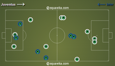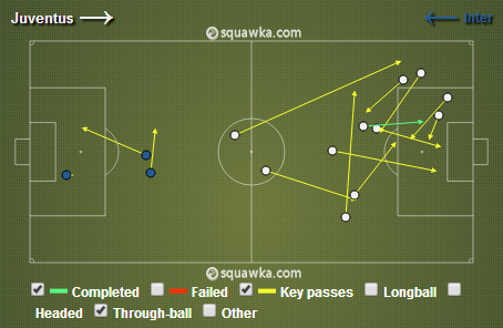 Ювентус лучше извлекал пользу из своего владения мячом, о чем свидетельствует количество обостряющих передач. При этом пять из 11 обострений были направлены в штрафную Интера. У нерадзурри, как видим, всего три обостряющих паса.