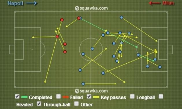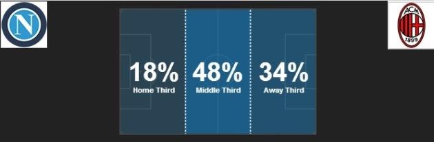 Один из редких показателей, по которым Милан сумел превзойти партенопейцев – это владение мячом, 52% — 48% в пользу россонери. Однако, вблизи штрафной гостей мяч находился почти в два раза больше времени, чем на подступах к штрафной Наполи. Таким образом, очевидно, что контролировать мяч Милану в большинстве случаев удавалось только в центре поля и около своей штрафной.