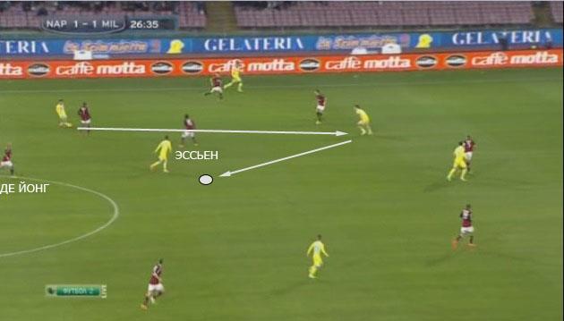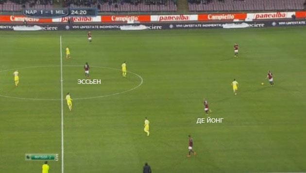 Выше показан идентичный пример. Милан предоставил Наполи слишком много пространства на своей половине поля, которым команда Наполи прекрасно воспользовалась.