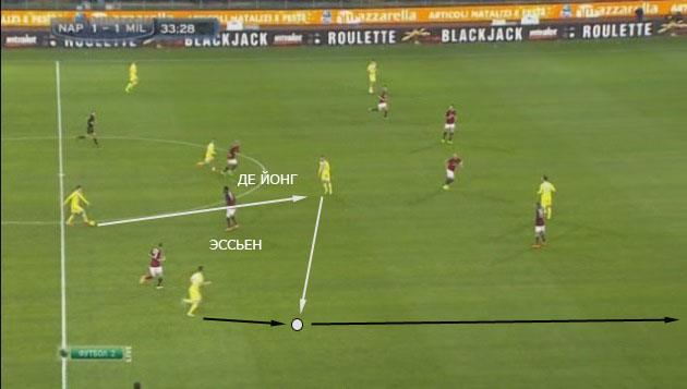 Этот розыгрыш можно назвать классическим: передача за спины опорникам (см. на позиции Эссьена и Де Йонга), после чего следует скидка в свободную зону.
