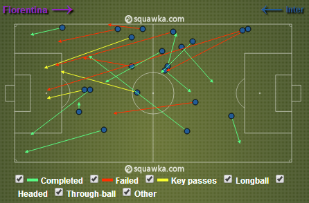 В отсутствие аттакканте, привыкших действовать в штрафной, приходилось бить издали — оттуда Фиалки нанесли 56% своих ударов. Интер с дальней дистанции пробил всего дважды, и это едва не привело к голу — Родриго Паласио попал в штангу.