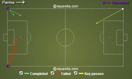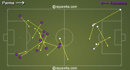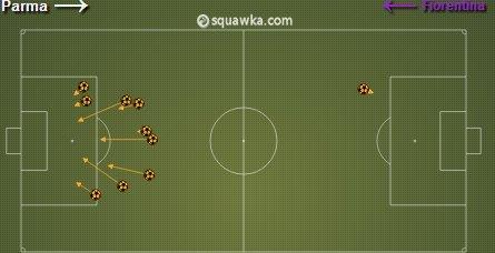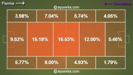 Зоны игровой активности показывают, что преимущество Фиорентины во владении мячом не было обусловлено исключительно перепасовками в центре поля. Мяч чаще находился на половине поля Пармы, в том числе и невдалеке от штрафной.