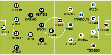 Говоря о составах, стоит отметить, что у гостей вновь не сможет сыграть Франческо Тотти — без капитана, как известно, результативность команды становится на порядок ниже. Зато готов выйти Кевин Строотман, повредивший колено в матче за сборную. У Наполи и вовсе нет проблем — к отсутствию Хуана Суньиги и Джандоменико Место все давно привыкли.