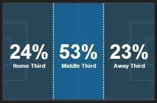 Начинали игру римляне без Тотти и Де Росси, а в самом начале встречи потеряли еще и Строотмана, но и без троих системообразующих футболистов Рома владела территориальным преимуществом в матче. Джаллоросси сделали за 90 минут 600 передач, а Наполи — всего 349. Однако контроль мяча далеко не всегда означает контроль игры. Как показано ниже, мяч доставлялся к штрафной площадке Наполи не чаще, чем к штрафной площадке Ромы. Это подтверждает, что джаллоросси в основном приходилось ограничиваться контролем мяча в центре поля, а с продвижением вперед у них возникали проблемы.