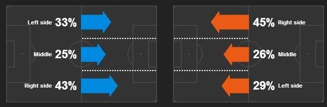 Выше мы также можем видеть смещение игроков атаки каждой из команд к правому флангу. Маджо и Майкон проводили больше времени в атаке, чем их коллеги с противоположных флангов, и при этом получали гораздо больше поддержки от партнеров. Схема ниже демонстрирует, что оба соперника провели по правому флангу почти половину своих атак.
