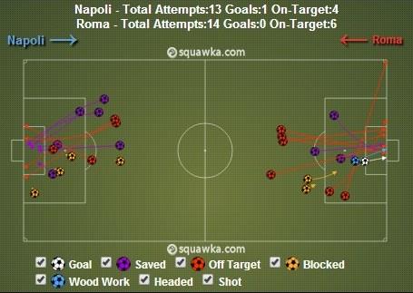 Если возвращаться к преимуществу Ромы во владении мячом, то его неэффективность подтверждает также количество ударов (13 у Наполи, 14 у Ромы) и острых/обостряющих передач (9 против 11). Как видите, по этим показателям преимущество римлян минимально. В результате у Наполи 2,6% передач были эффективными в плане обострения атак, а у Ромы всего 1,8%. Хотя в первом тайме Волки действительно создали больше опасных моментов, чем Наполи (у адзурри их практически не было), но реально голевых среди них было минимум, а Пепе Рейне вступать в игру приходилось преимущественно после ударов со средней и дальней дистанции. А после перерыва уже Наполи начал тревожить Де Санктиса (все точные удары партенопейцы нанесли после 44-й минуты).