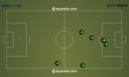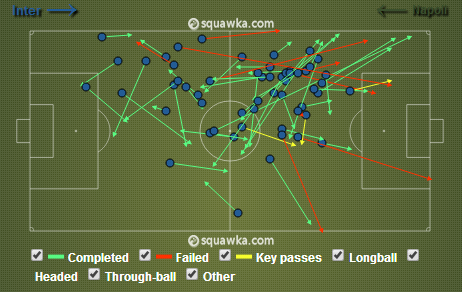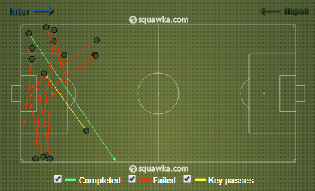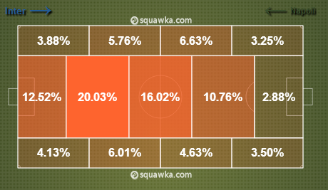 Интер, несмотря на фактор своего поля, отдал преимущество гостям — Наполи сделал на 125 передач больше, чем миланцы. Из схемы зон владения мячом видно, что нерадзурри контролировали его на своей половине поля, преимущественно в опорной зоне.