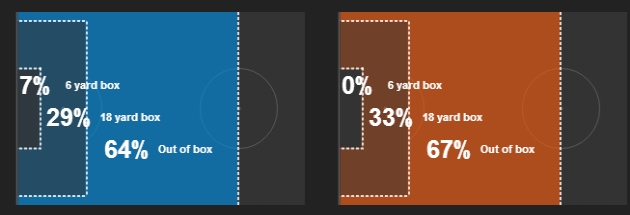 Как уже говорилось, подобраться к воротам было сложно обеим командам. Большинство ударов они нанесли из-за пределов штрафной и с дальней дистанции. На схеме справа удары Интера, слева — Наполи.
