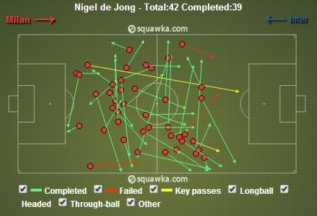 Что касается индивидуальных действий игроков, любопытно проявил себя Найджел де Йонг. Жесткий опорник, задачей которого является разрушение атак соперника, на этот раз выиграл всего лишь два единоборства из шести, но при этом чаще, чем Монтоливо и Поли, получал мяч, отдавал передачи (93% точности), причем не только короткие, а два из его пасов — короткий и длинный — были обостряющими. Именно Найджел забил победный гол в ворота Интера, так что в этом дерби де Йонг неожиданно оказался чуть ли не главной ударной силой Кларенса Зеедорфа.