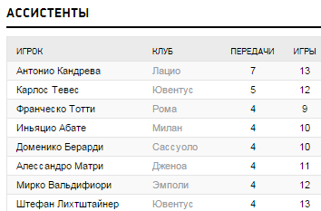 - Процент точных передач: Рома (88%), Ювентус (85%), Наполи, Интер, Фиорентина (по 84%)