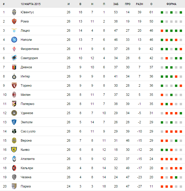 В отчетном туре Старая Синьора обыграла переживающий не лучшие времена Сассуоло — нероверди за последние четыре тура не взяли ни одного очка. Показательно, что их лучший бомбардир Симоне Дзадза не нанес ни одного удара в створ ворота Марко Сторари, подменявшего простудившегося Джиджи Буффона. Команда Эусебио Ди Франческо в девяти очках от зоны вылета — пока переживать нечего, но тенденция намечается не самая приятная. Благо в следующем туре играть дома с Пармой — можно и на победу рассчитывать.