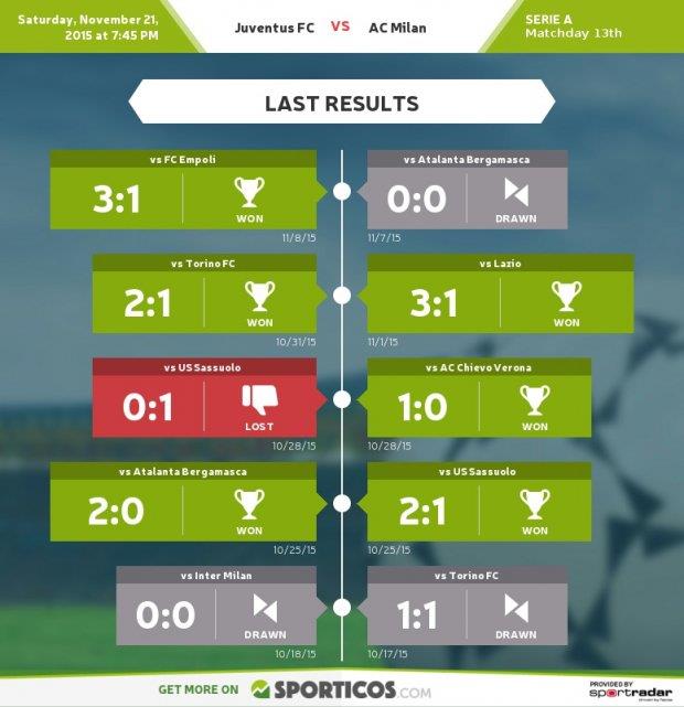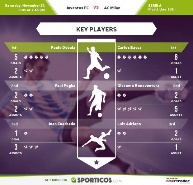 Милан в Серии А не проигрывает уже 5 матчей подряд, но у главного тренера хватает кадровых проблем. Команда уже привыкла играть без Менеза и Балотелли, кого на острие атаки заменит троица Черчи — Бонавентура — Бакка. Джакомо удачно отсидел дисквалификацию и полон сил выйдет на поле Ювентус Стэдиум.