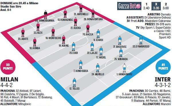 Тренеры будут иметь практически оптимальный состав в преддверии встречи. У россо-нери все также травмированы Родриго Эли и Диего Лопес, Жереми Менез уже практически восстановился, даже попал в заявку. Кто также не поможет Синише Михайловичу, так это Луис Адриано. После кубкового матча игрок почувствовал боли в груди, но бразилец не игрок основного состава, да и Балотелли вернулся в строй, посему потеря будет безболезненной. У Интера и вовсе лазарет пустеет, Иван Перишич получил небольшой растяжение мышц левой лодыжки и вряд ли сможет помочь своей команде в матче.