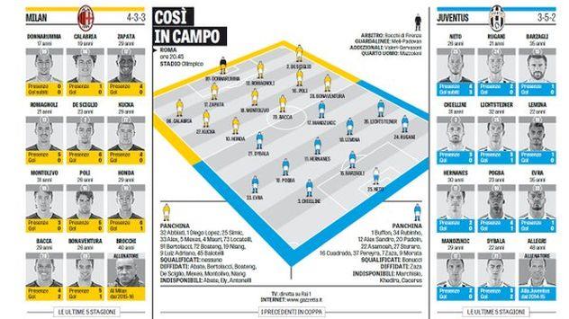Обе команды подходят к финалу не в полноценных составах. Главная проблема Кристиана Брокки – травмированные Иньяцио Абате и Лука Антонелли, игроки на флангах защиты. Заменят их Давиде Калабрия и Маттиа Де Шильо соответственно. По сообщениям итальянских СМИ, Брокки сегодня откажется от Хонды в роли треквартисты, а вернется к схеме 4-3-3, которую в конце прошлого года практиковал Михайлович. Главной ударной силе Милана Карлосе Бакке будет помогать вышеупомяный Хонда и Бонавентура. Возвращение Джакомо в строй как никогда кстати: в нынешнем сезоне россо-нери при отсутствии игрока сборной Италии ни разу не побеждали. Пара Бакка-Бонавентура станет главным оружием красно-черных – в чемпионате Джек отдал восемь голевых передач, половина которых предназначалась колумбийцу.