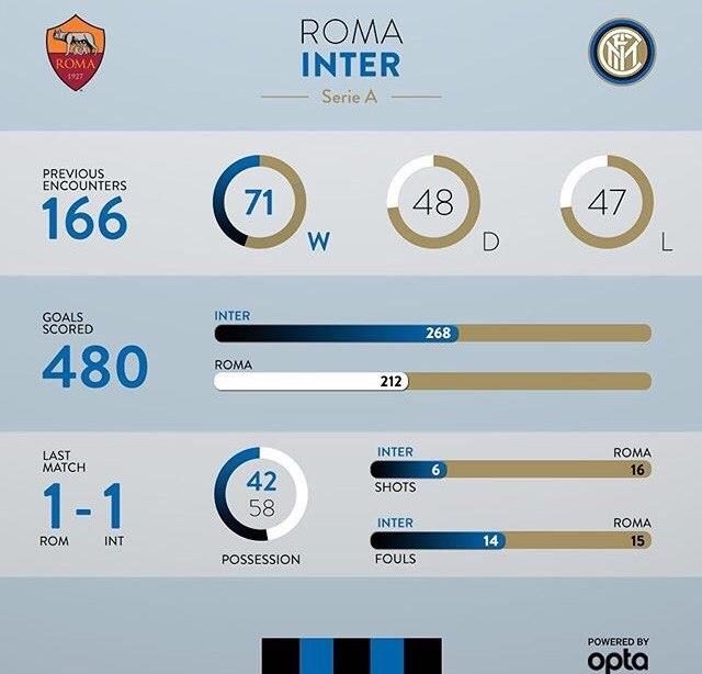 - Между Ромой и Интером сыграно 166 матчей в рамках Серии А: нерадзурри добыли 71 победу, а римляне – 47.