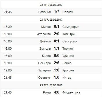 4:0 – Рома уничтожает Фиорентину и возвращается на второе место в турнирной таблице. Команда Пауло Соузы показала ужасную игру и впервые проиграла в чемпионате в этом году. У римлян по календарю дальше Кротоне, но даже к следующему туру преимущество Ювентуса может увеличиться, так как уже сегодня Старая Синьора проведет перенесенный из-за Суперкубка Италии матч против тех же Пивагорейцев, где шансы у подопечных Аллегри проиграть просто мизерные.
