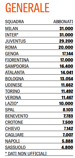 Авторитетное издание La Gazzetta dello Sport опубликовало список продаж сезонных абонементов клубов высшего итальянского дивизиона.