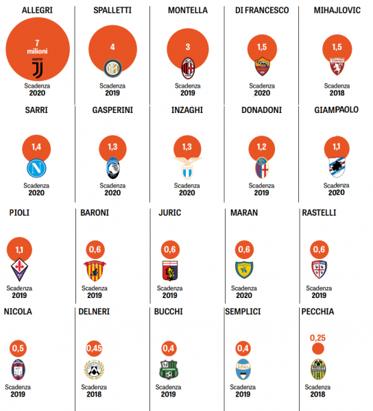 Итальянское издание La Gazzetta dello Sport представило обновленный рейтинг зарплат тренеров Серии А. Самым высокооплачеваемым является Массимилиано Аллегри, он зарабатывает в год 7 миллионов евро.