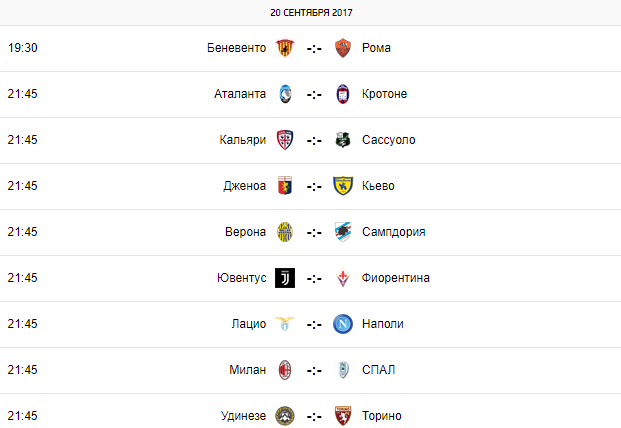 Football.ua представляет анонс матчей пятого тура чемпионата Италии, запланированных на среду, 20 сентября.