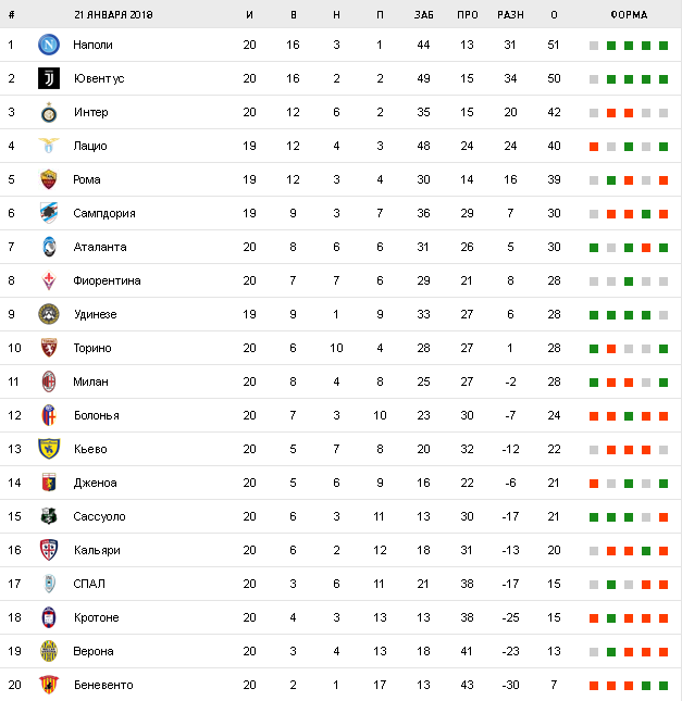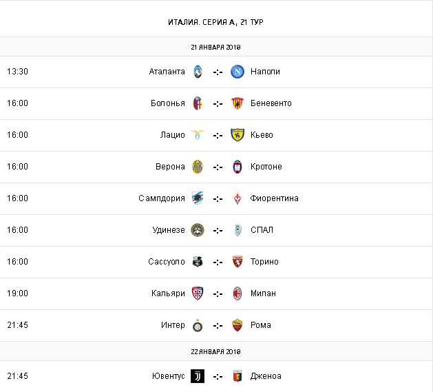 Отгуляв непродолжительные зимние каникулы, команды Серии А вновь возвращаются к трудовым будням. Кто-то успел усилить свой состав на трансферном рынке, кто-то до сих пор переживает потери, а кто-то просто как следует отдохнул. Но теперь каждому предстоит вновь решать свои задачи. Стоит отметить, что в связи с непростым выездом Наполи в Бергамо и легкой прогулкой, которая, скорее всего, ожидает Ювентус в домашнем поединке против Дженоа, у "старой синьоры" есть шанс взобраться на привычное для себя первое место в турнирной таблице.