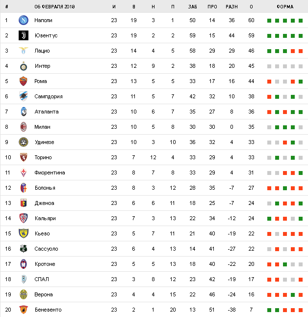 В итоге на данный момент имеем следующую картину: Сампдория – 38 очков, Аталанта – 36, Милан – 35.