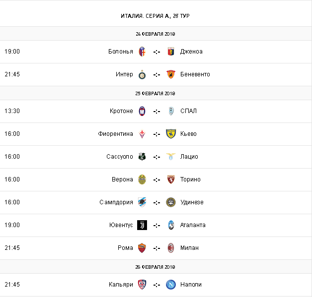 Football.ua представляет анонс матчей двадцать шестого тура чемпионата Италии, которые состоятся в субботу.