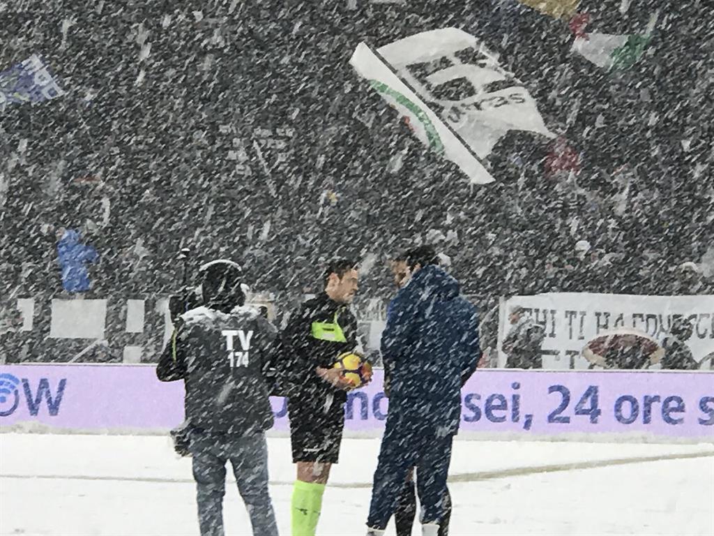 Однако затем арбитр матча Маурицио Мариани пригласил на совещание капитанов команд Джанлуиджи Буффона и Рафаэля Толоя. После непродолжительной беседы, во время которой тоскливые взгляды совещавшихся сторон то устремлялись к мрачным небесам, ронявшим крупные хлопья снега, то упирались во все уплотнявшийся снежный покров под ногами, было принято решение, что футбол в таких условиях возможен разве что в компании друзей где-нибудь в парке.