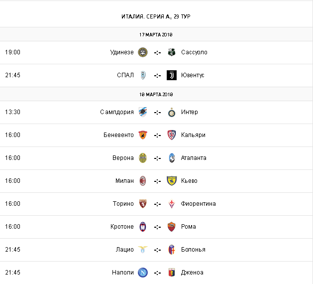 Двадцать девятый тур чемпионата Италии обделен "мегафайтами" грандов, зато изобилует скрытой интригой. Каждый будет стараться сыграть по крайней мере не хуже, чем конкуренты в параллельных матчах. Исключение представляет лишь встреча Сампдории и Интера, результат которой может существенно повлиять на расклады как в борьбе за место в зоне Лиги чемпионов, так и в зоне Лиги Европы. Ну и с натяжкой матч Торино – Фиорентина можно назвать битвой за путевку в еврокубки, а поединок Беневенто – Кальяри сражением за выживание. Но главный вопрос – сможет ли Наполи сократить отставание от Ювентуса?