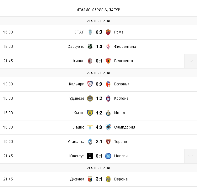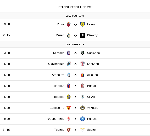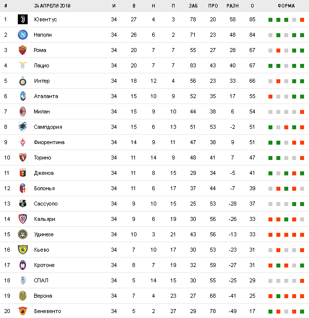 В тридцать четвертом туре чемпионата Италии главным вопросом на повестке дня стояла чемпионская интрига. В очном противостоянии двух претендентов на скудетто — Ювентуса и Наполи — претендент обыграл действующего чемпиона и сократил дистанцию между ними до одного очка, что гарантирует очень напряженную и практически непредсказуемую концовку первенства. На противоположном полюсе турнирной таблицы потерял все шансы на спасение, лишив при этом Милан надежды на место в зоне Лиги чемпионов. В остальных локальных битвах пока полный туман.
